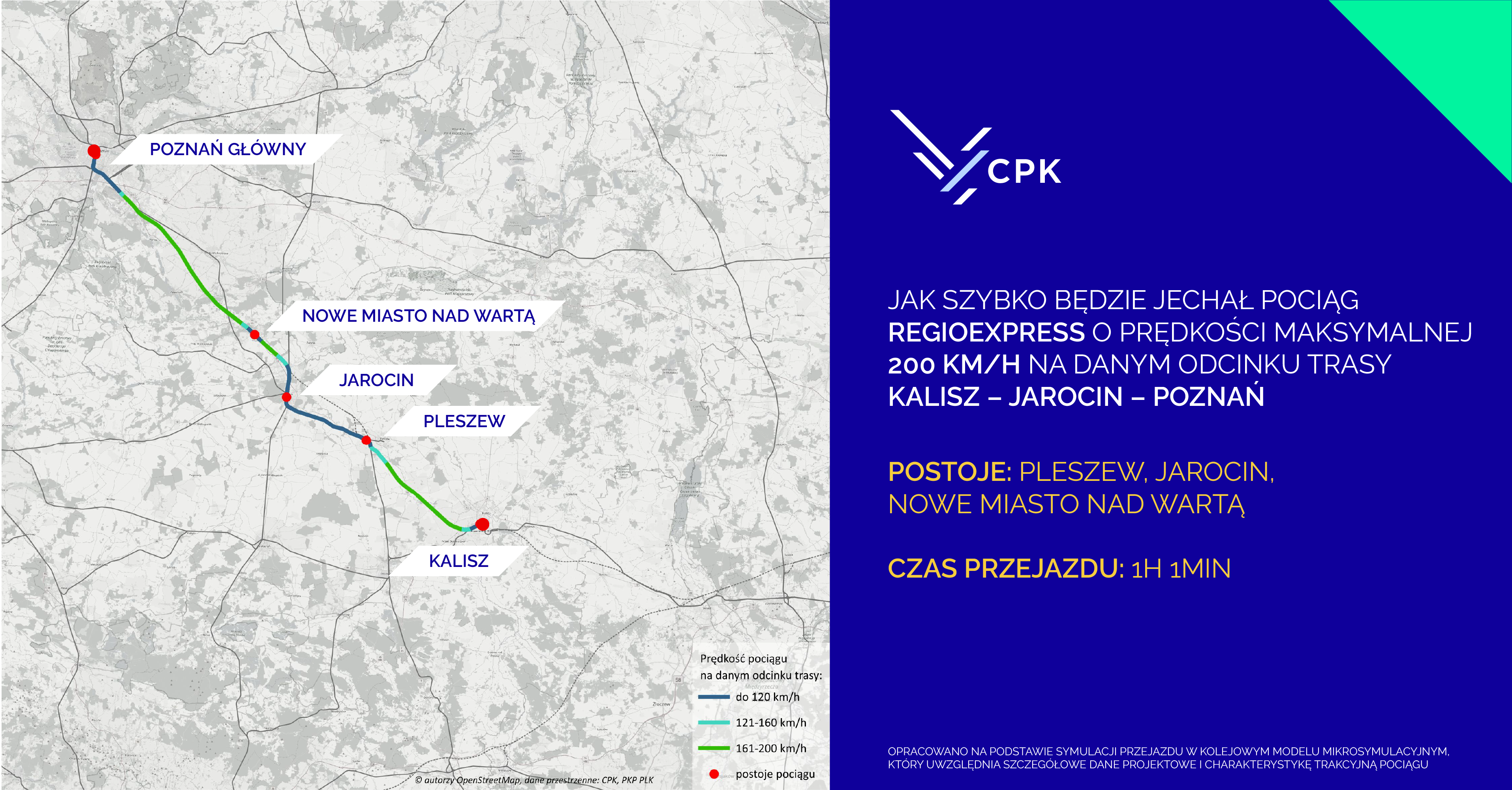 Kursujące po linii „Y” wolniejsze pociągi obsłużą pasażerów z miast średniej wielkości, np. z Sieradza i Kalisza. Dla przykładu: poniżej prezentujemy zakres prędkości dla pociągu RegioExpress jadącego z prędkością do 200 km/godz. z Poznania do Kalisza z postojami w Nowym Mieście nad Wartą, Jarocinie i Pleszewie – informuje CPK.