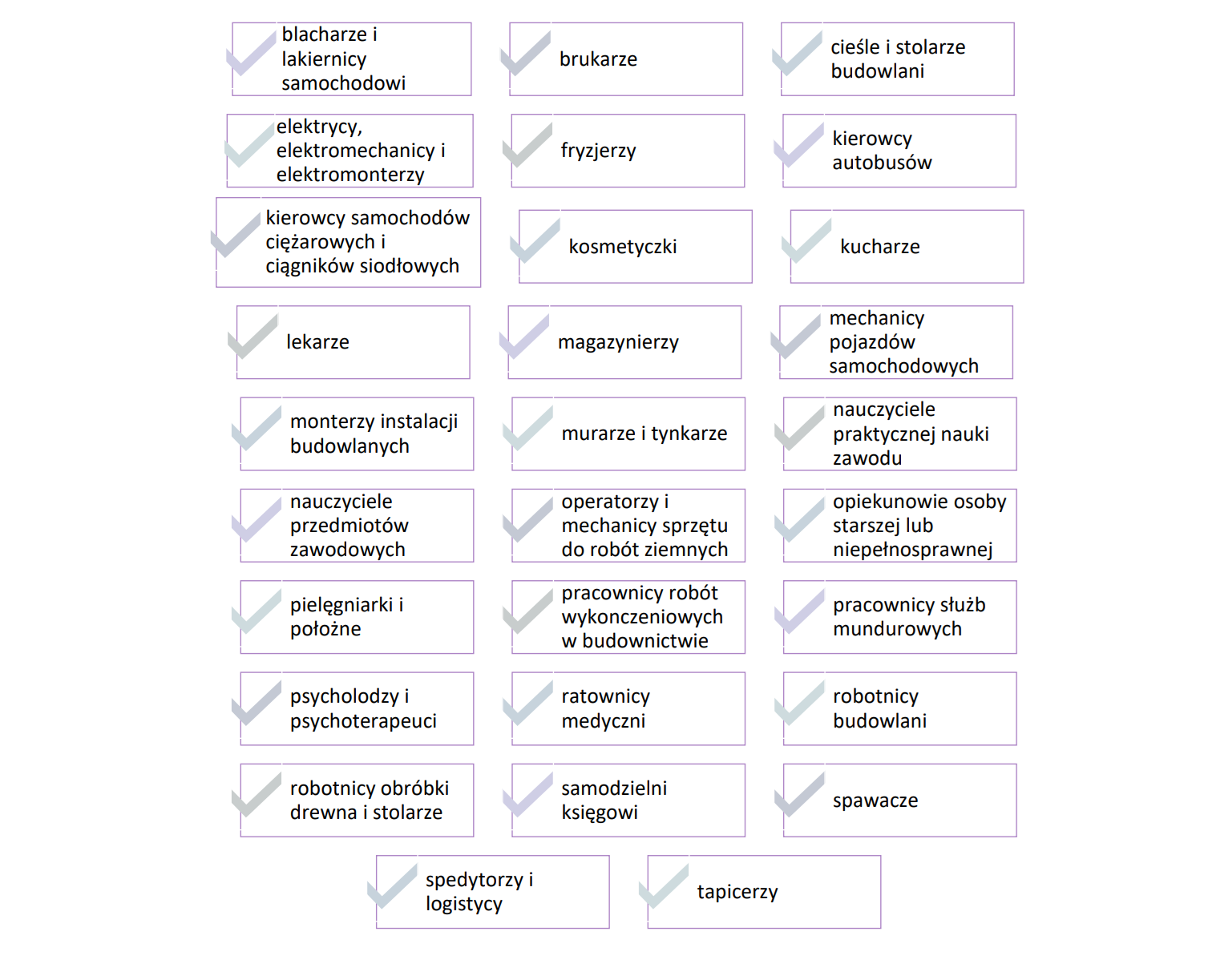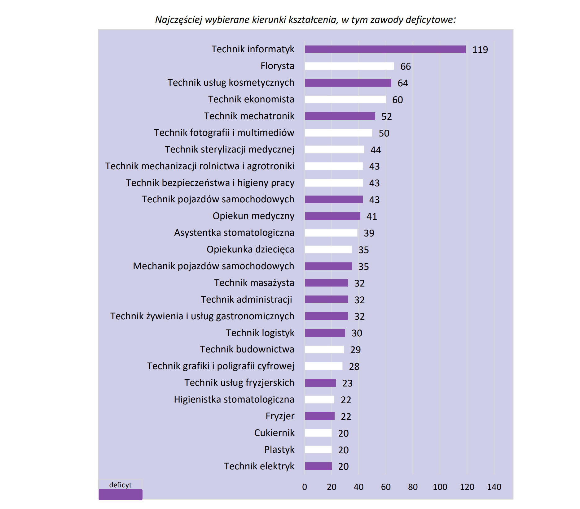 Lista zawodów deficytowych, tj. takich, na które zapotrzebowanie jest większe niż liczba chętnych do pracy jest długa. Najwyższy deficyt „pośredniaki” odnotowują w przypadku psychologów i psychoterapeutów. Odrębną dziedziną są zawody deficytowe, na które popyt jest wysoki nieprzerwanie od 5 lat. Do takich zawodów należą blacharze i lakiernicy samochodowi, brukarze, cieśle i dekarze, pielęgniarki, ratownicy medyczni. Pełna lista profesji poniżej.
