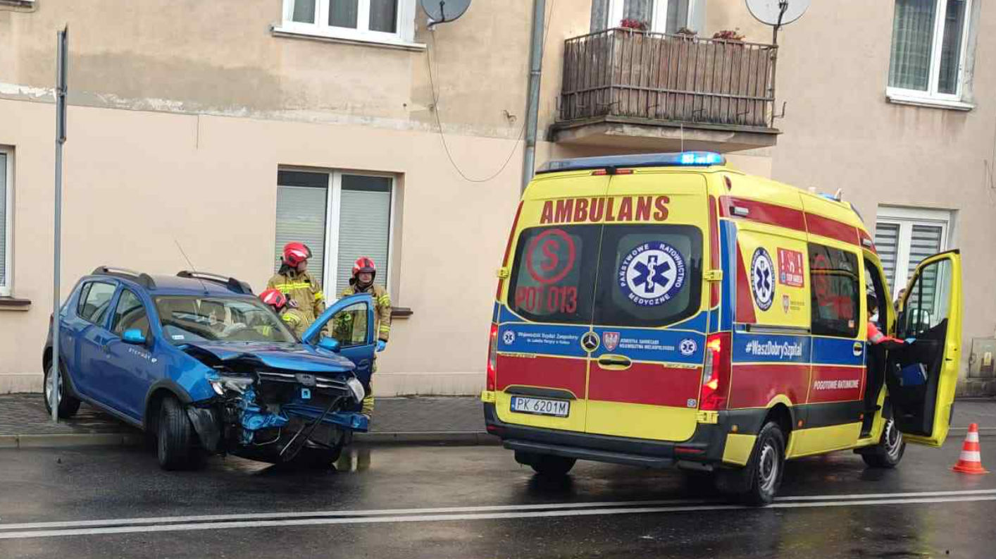 W wyniku zderzenia samochodów osobowych skoda wypadła z drogi, uderzyła w znak, a następnie w ścianę pobliskiego salonu fryzjerskiego. Kierowcy opuścili pojazdy o własnych siłach, jednak oboje skarżyli się na dolegliwości bólowe. Na miejsce wezwano dwa zespoły ratownictwa medycznego oraz straż pożarną, która zabezpieczyła teren zdarzenia. Droga była tymczasowo zablokowana.