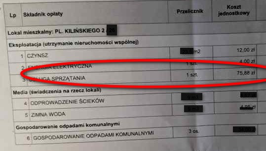 W lutym najemcy otrzymali pismo od Administracji o wprowadzeniu dodatkowej opłaty – 75,88 zł co miesiąc za usługę utrzymania czystości kamienicy i podwórka.