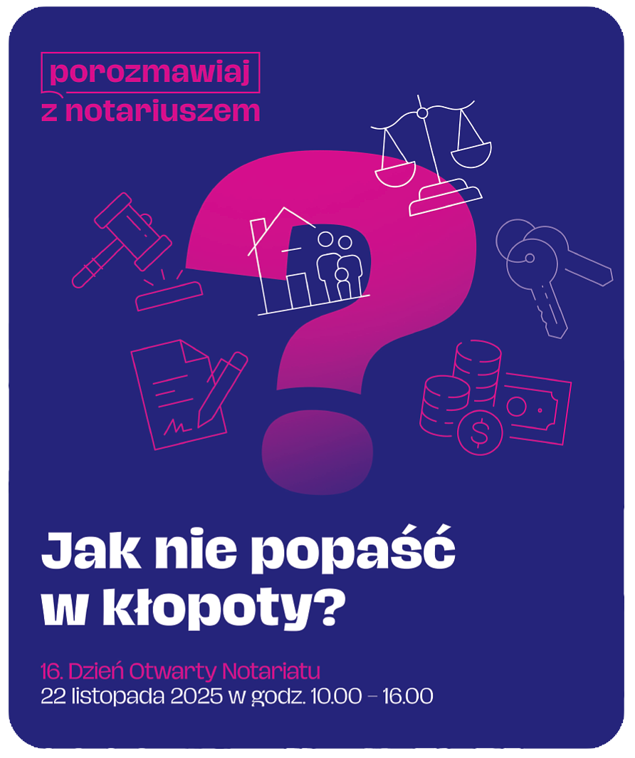 Notariusze będą dostępni dla osób zainteresowanych bezpłatną konsultacją w sobotę 22 listopada w godzinach 10:00–16:00 na Uniwersytecie Kaliskim (ul. Nowy Świat 4, budynek Rektoratu – sala prof. Glinkowskiego). To doskonała okazja, by uzyskać praktyczne porady prawne i dowiedzieć się więcej o kwestiach dotyczących każdego z nas.