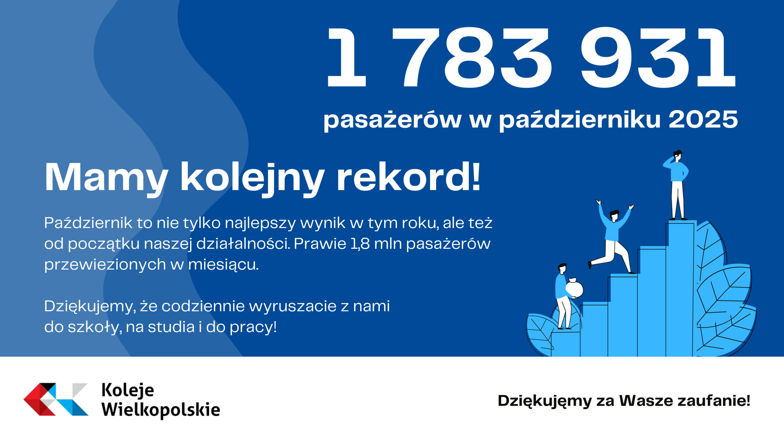 Z przyjemnością informujemy, że październik 2025 okazał się rekordowym miesiącem w historii Kolei Wielkopolskich. W tym czasie z naszych usług skorzystało 1 783 931 podróżnych – to najwyższa liczba pasażerów w skali miesiąca od początku działalności spółki! – informuje spółka Koleje Wielkopolskie.