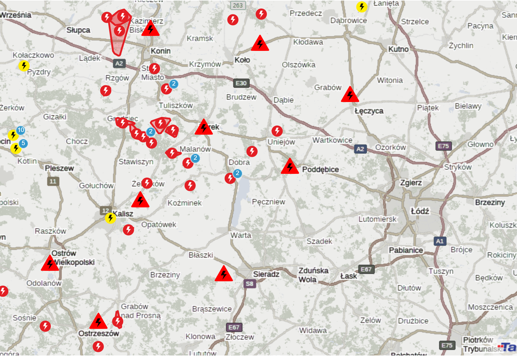 Trwają przerwy w dostawach energii elektrycznej. Bez zasilania pozostaje ok. 7677 odbiorców i 269 stacji transformatorowych w powiatach: kaliski, kolski, koniński, łęczycki, ostrowski, ostrzeszowski, poddębicki, sieradzki, turecki.
