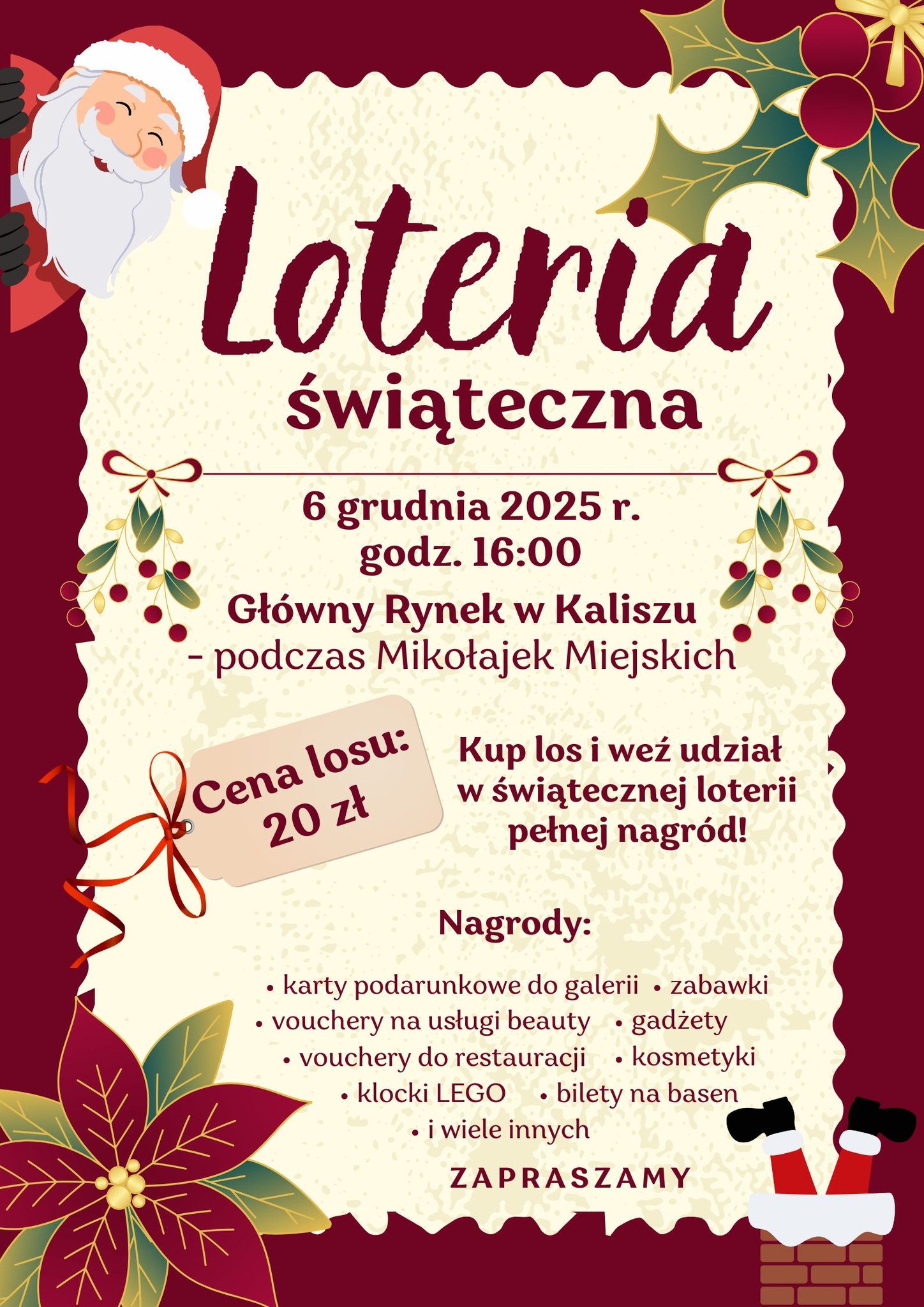 Podczas tegorocznych Mikołajek na Głównym Rynku w Kaliszu odbędzie się wyjątkowa atrakcja – Świąteczna Loteria, przygotowana przez rodziców uczniów klasy 5B ze Szkoły Podstawowej nr 7. Wydarzenie zaplanowano na 6 grudnia 2025 r. o godz. 16:00.