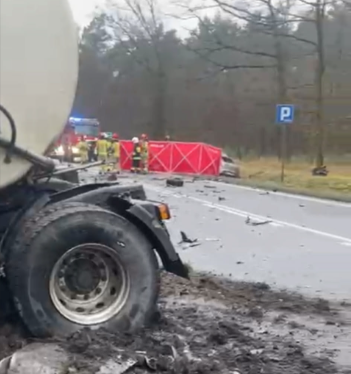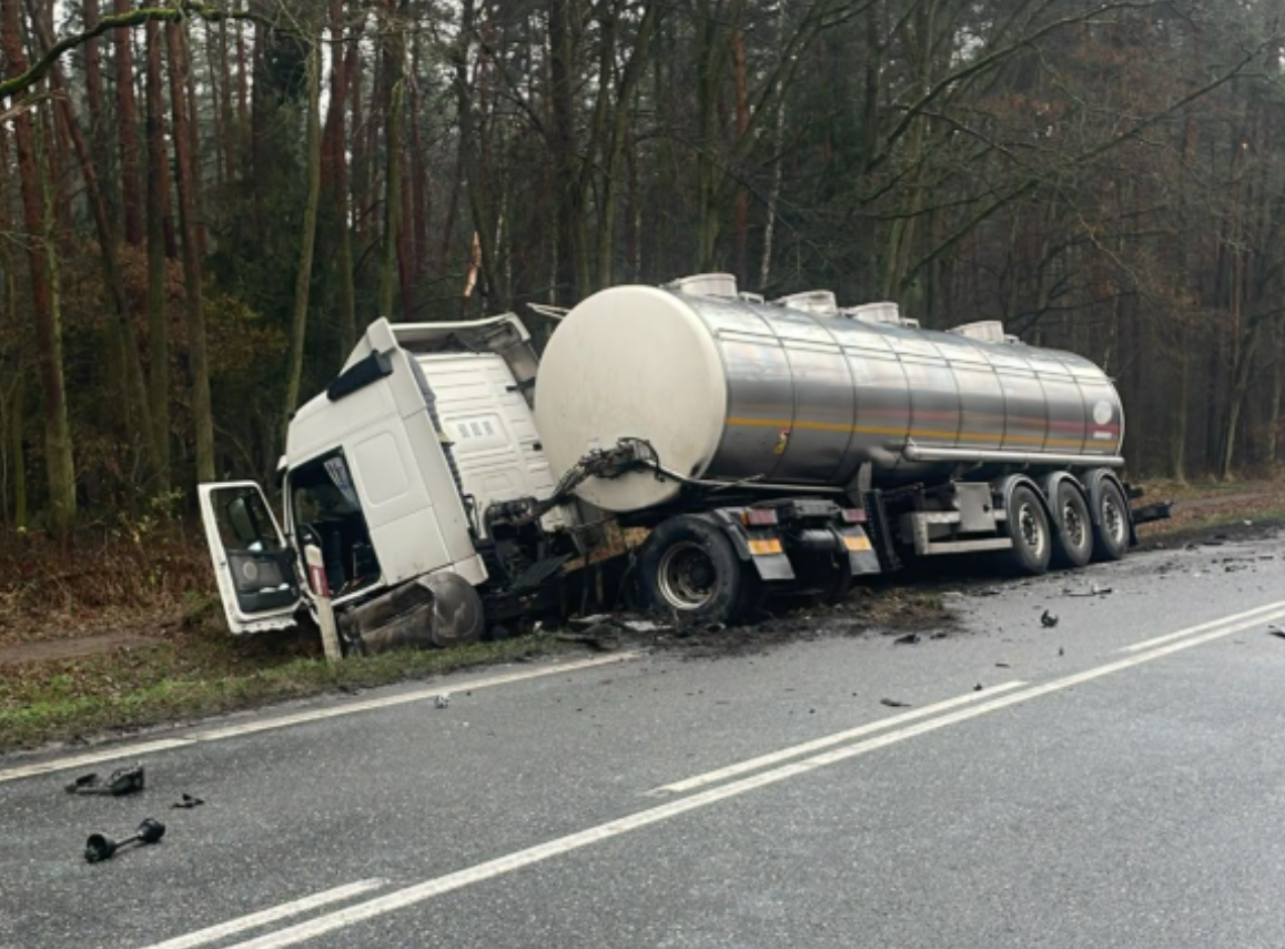 Do wypadku doszło dziś, w piątek 5 grudnia około godziny 10:00 na drodze krajowej nr 12 między Gołuchowem a Kucharami. Jak wynika ze wstępnych ustaleń, doszło tam do czołowego zderzenia samochodu osobowego marki Fiat z cysterną. Siła uderzenia była bardzo duża, oba pojazdy po zderzeniu zjechały z jezdni i zatrzymały się w przydrożnym rowie.