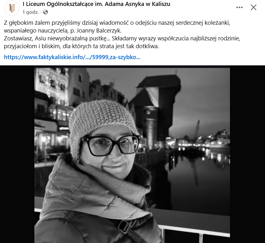 Cała społeczność I Liceum Ogólnokształcącego im. Adama Asnyka w Kaliszu jest pogrążona w smutku. Jesteśmy wdzięczni, że mogliśmy Cię spotkać na naszej drodze Asiu, dziękujemy że Cię mieliśmy w naszym życiu - napisała Urszula Janczar, dyrektor I Liceum Ogólnokształcącego im. Adama Asnyka w Kaliszu.