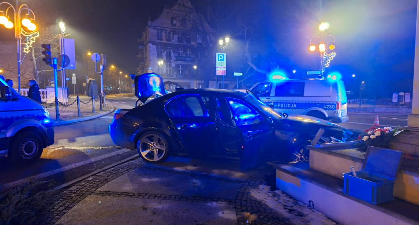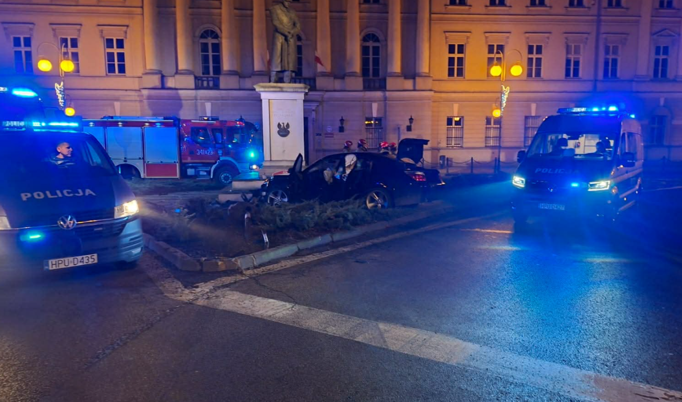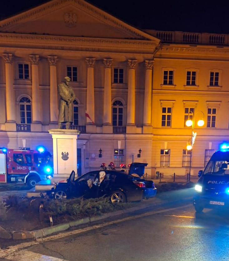 Samochód najpierw uderzył w sygnalizator świetlny, a następnie w pomnik marszałka Piłsudskiego. W aucie podróżowały trzy osoby. Jedna z nich została przewieziona do szpitala, ale nie odniosła poważnych obrażeń.