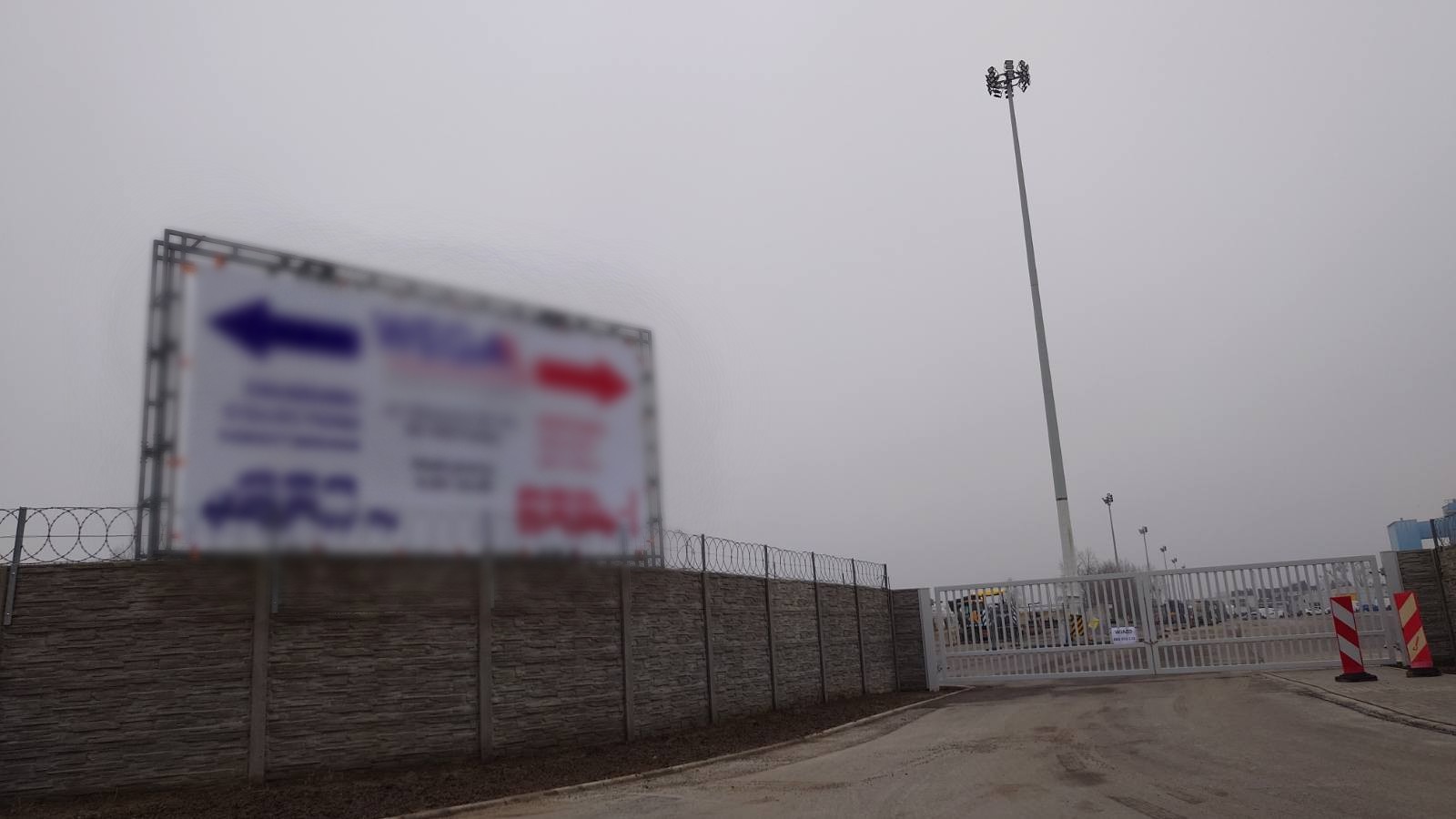 Po środku placu firma ustawiła rząd wysokich słupów z intensywnym oświetleniem
