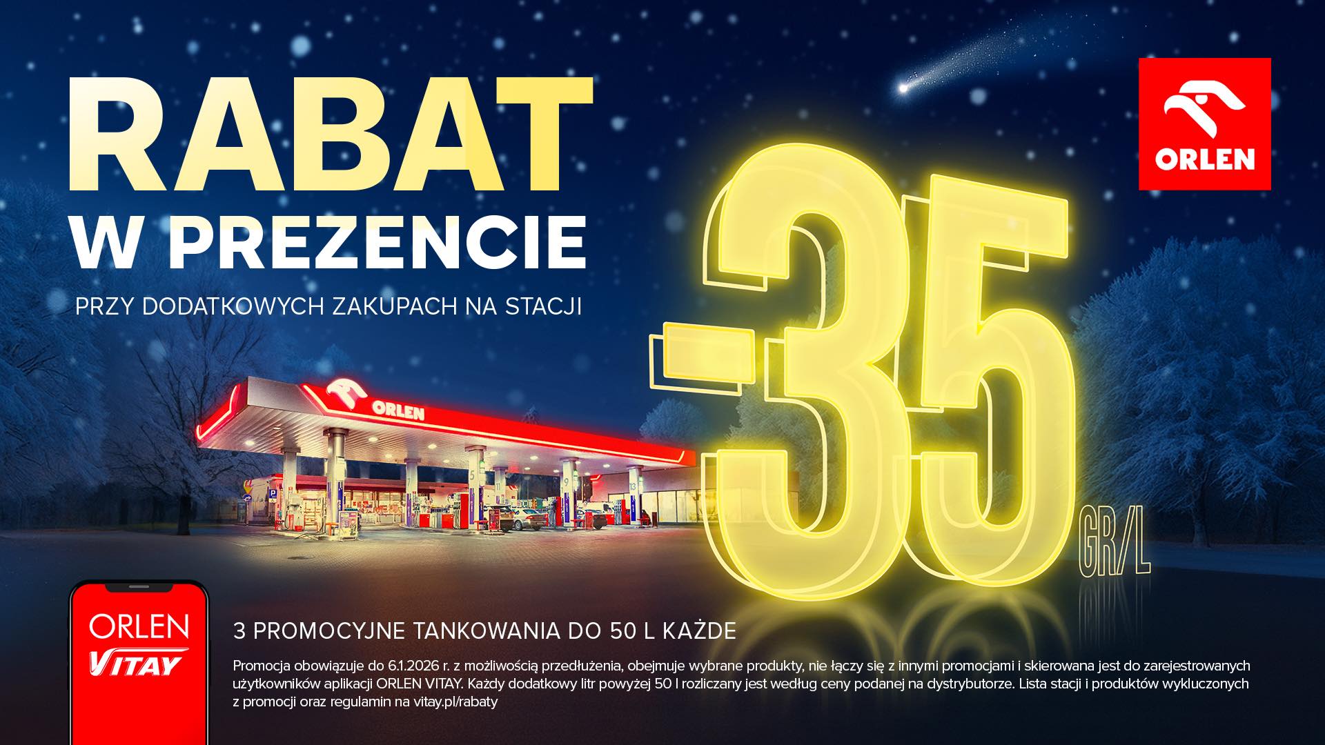 Od dzisiaj, tj. 19 grudnia do 6 stycznia 2026 roku na stacjach Orlenu w całej Polsce można kupić benzynę i olej napędowy o 35 groszy taniej na litrze niż cena „na słupie”. Promocja dotyczy tych klientów, którzy mają aplikację Orlen Vitay i dokonają na stacji zakupu dowolnego towaru z poza oferty paliwowej. Jest jednak ograniczenie. Jeden użytkownik aplikacji może kupić do 150 litrów paliwa w promocyjnej cenie.