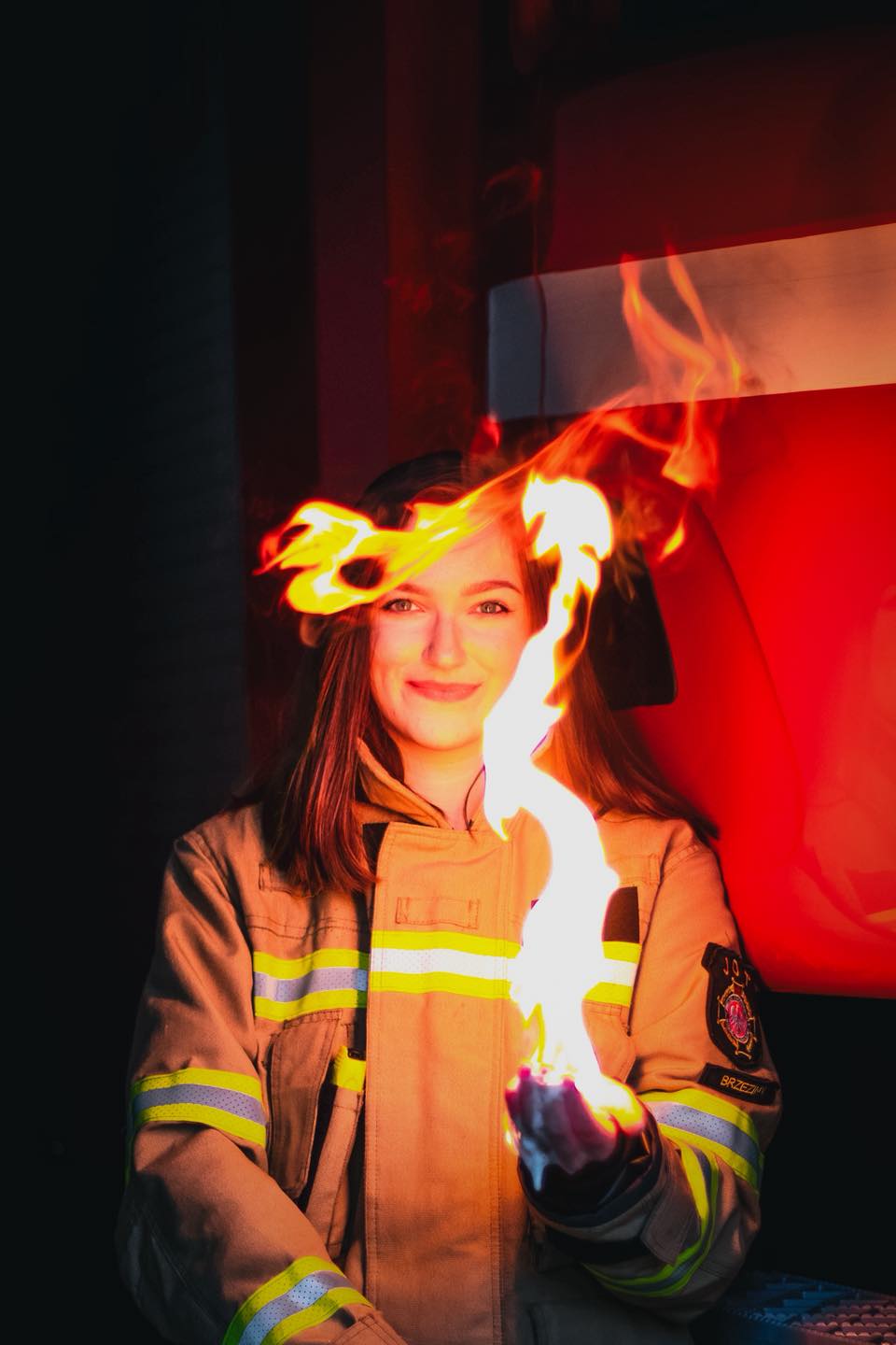 Gabriela Kupajczyk z zawodu i z pasji zajmuje się fotografią. Jej drugim zajęciem, w które wkłada równie dużo zaangażowania jest służba w OSP Brzeziny. Z połączenia tych dwóch pasji powstało prezentowane tutaj zdjęcie. Fotografia została wysłana na wojewódzki konkurs, organizowany przez komendę wojewódzką PSP w Poznaniu.