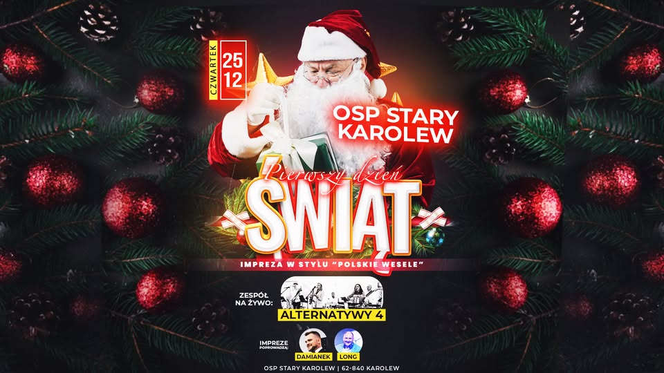 W czwartek, w Pierwszy Dzień Świąt Bożego Narodzenia - 25 grudnia, w remizie OSP Stary Karolew (gmina Koźminek) odbędzie się impreza w stylu „Polskie Wesele”, która z pewnością porwie do zabawy wszystkich miłośników tanecznych hitów i swojskiego klimatu. Organizatorzy zapowiadają gorącą atmosferę i muzykę, przy której trudno będzie usiedzieć w miejscu.
