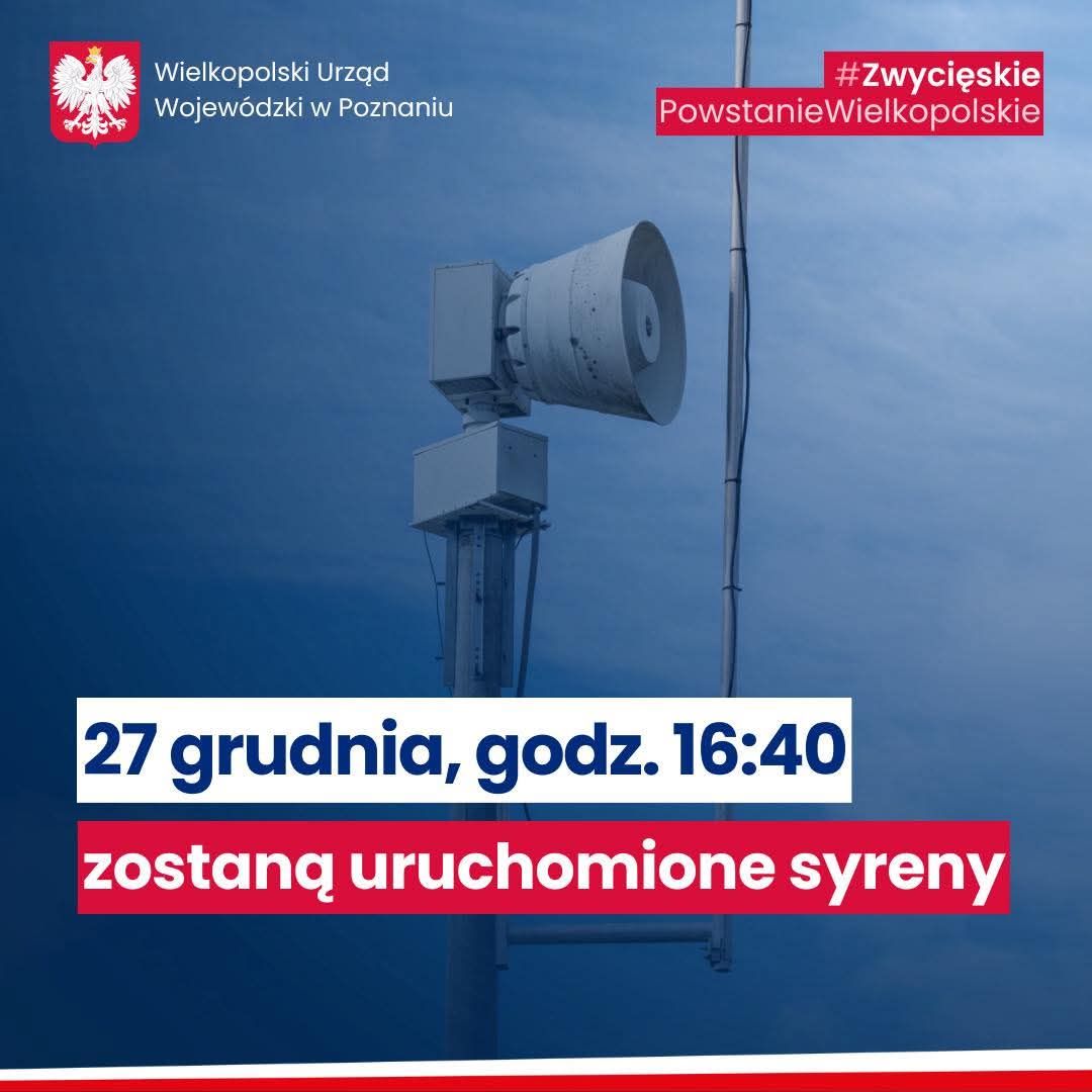 W związku z przypadającą 107. rocznicą wybuchu Powstania Wielkopolskiego, dzisiaj - 27 grudnia o godzinie 16:40 nastąpi głośne uruchomienie Centralnego Systemu Alarmowego Miasta Kalisza.