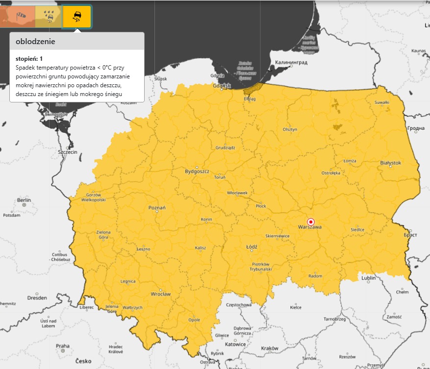 Ostrzeżenie pierwszego stopnia obowiązuje od dziś, od 19:00 do wtorkowego poranka, na ten moment do 7:00 rano.