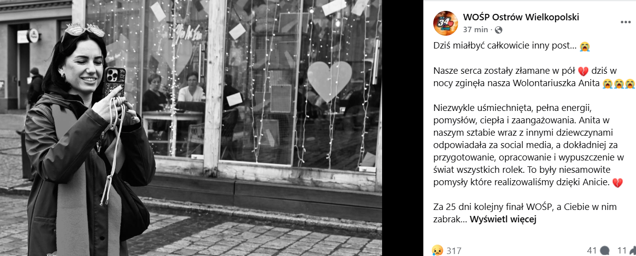 Z wyrazami współczucia i kondolencji dla rodziny zmarłej tragicznie Anity [*] - napisał na Facebooku Sztab WOŚP Ostrów Wielkopolski