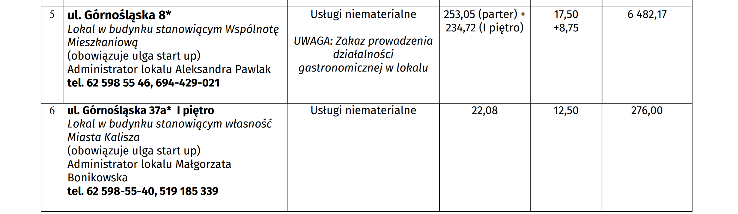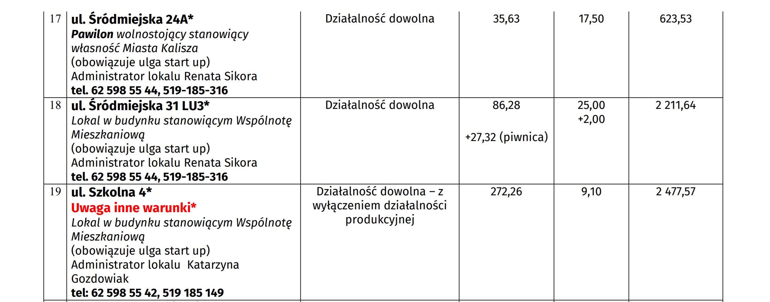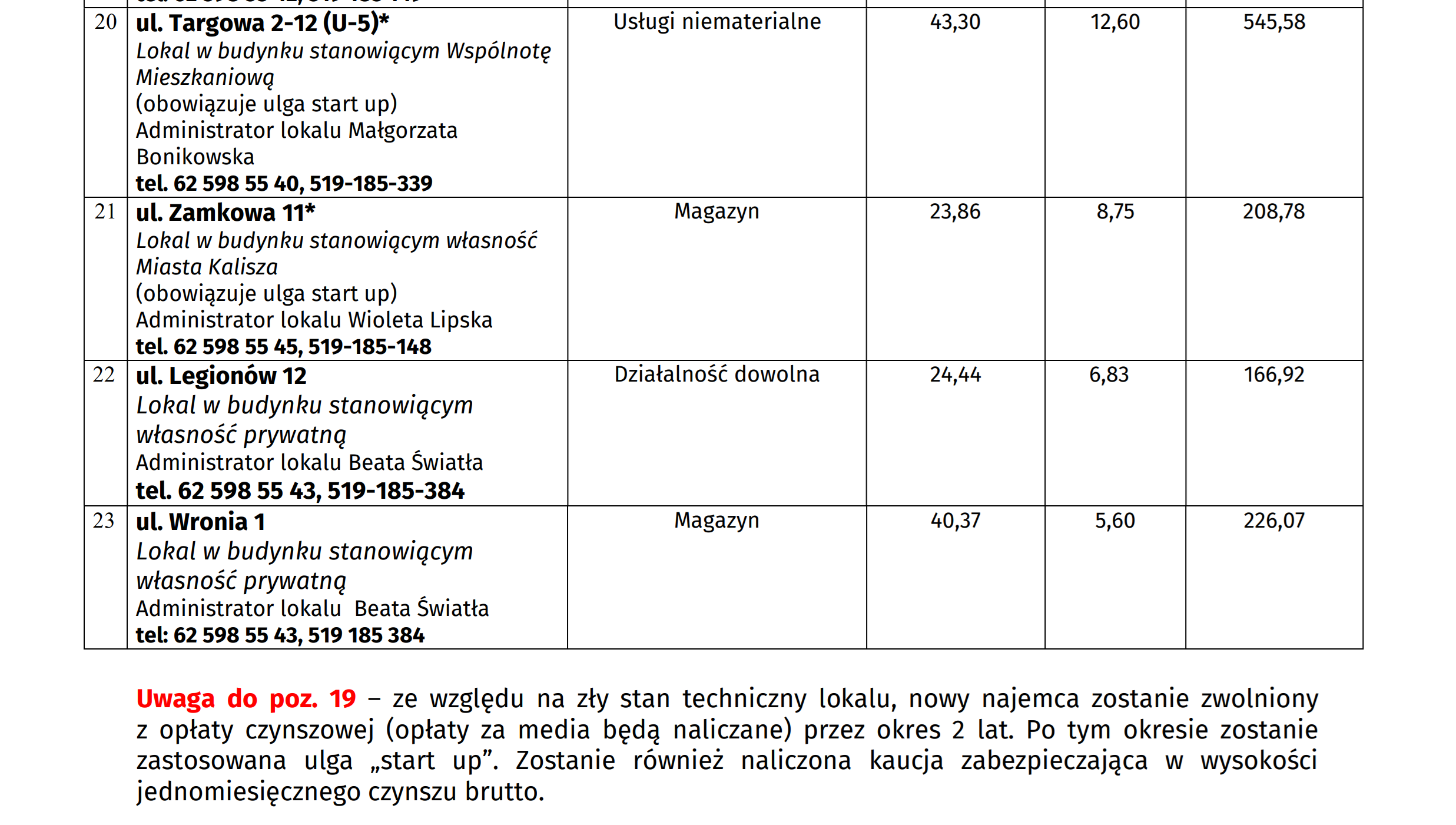 Do przetargu ustnego, który odbędzie się 15 stycznia br. może zgłosić się każdy, ale firmy, które działają od niedawna, tzw. startupy będą płacić czynsz w wysokości 50% wylicytowanej stawki. Tak będzie w pierwszy rok prowadzenia tam działalności, po 12 miesiącach czynsz wzrośnie do 75 proc. stawki bazowej. Najemca może też ubiegać się o obniżkę czynszu, jeśli będzie musiał przeprowadzić remont wynajmowanego lokalu. A poniżej przedstawiamy wykaz lokali z cenami wywoławczymi.
