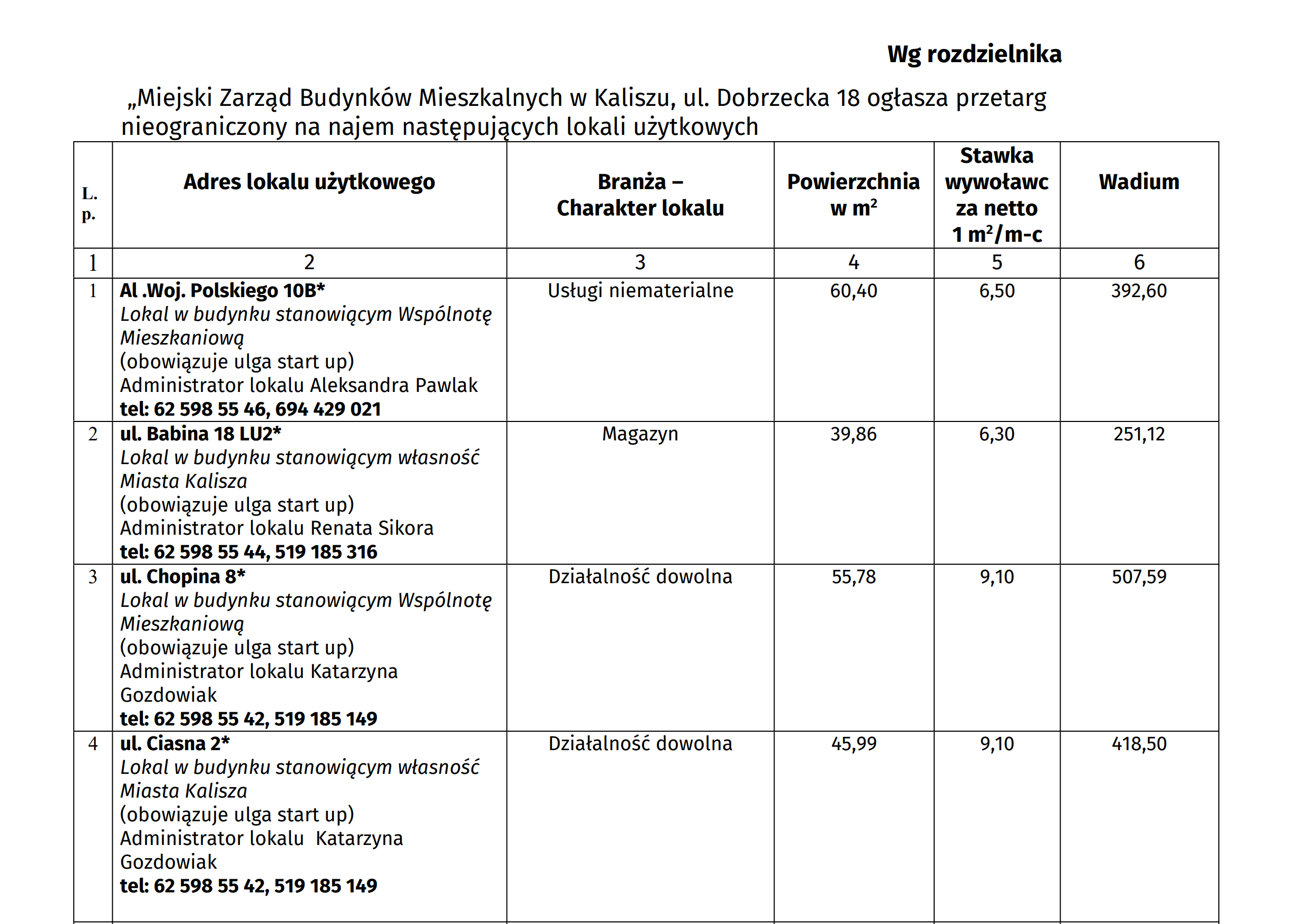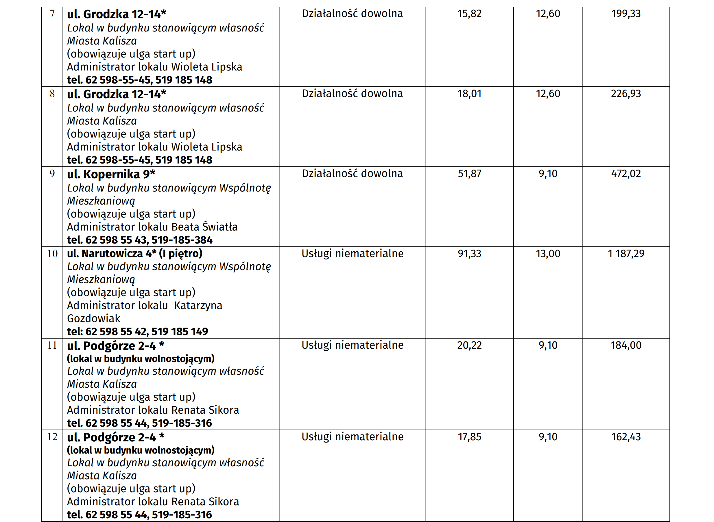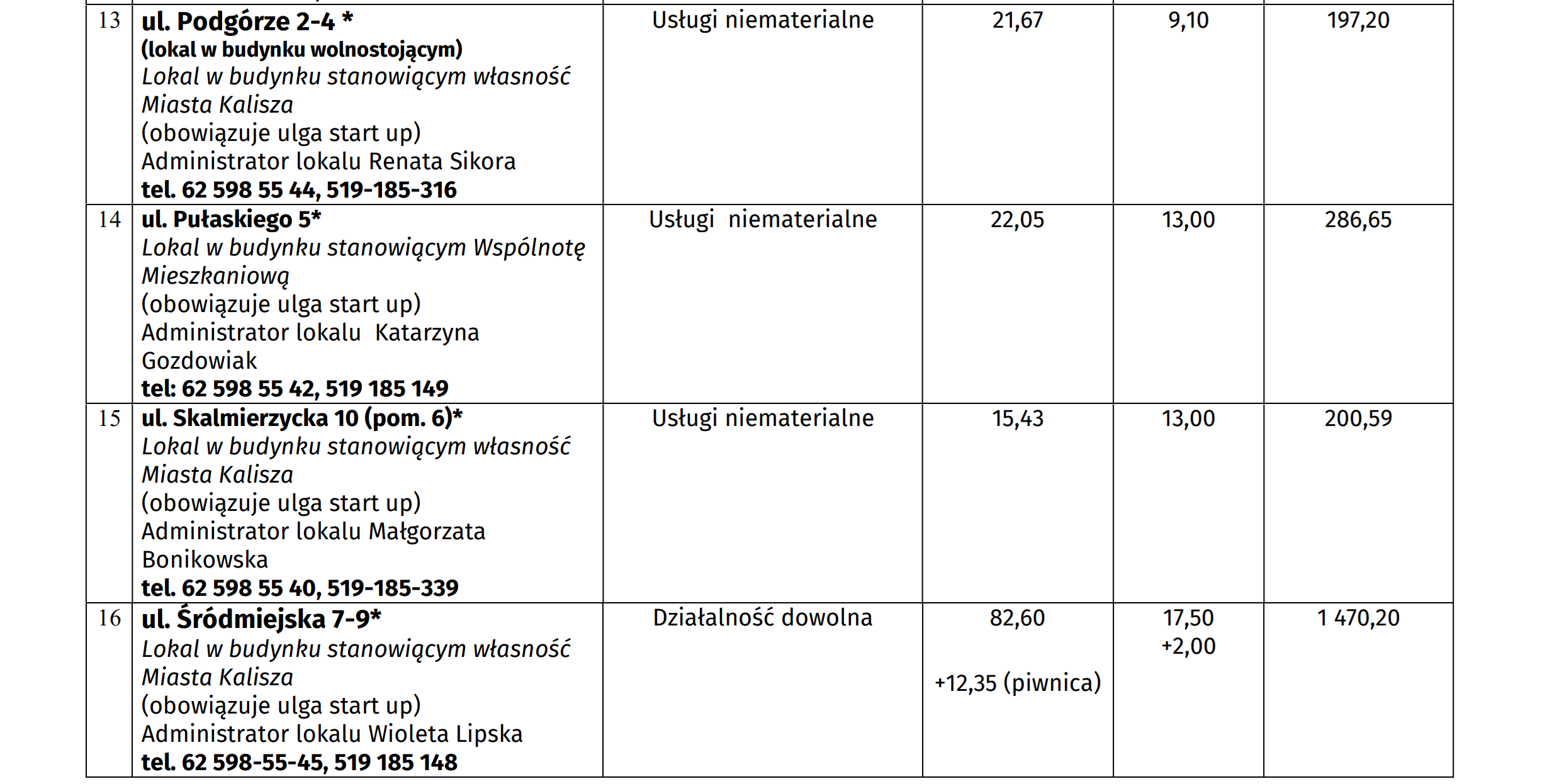 Do przetargu ustnego, który odbędzie się 15 stycznia br. może zgłosić się każdy, ale firmy, które działają od niedawna, tzw. startupy będą płacić czynsz w wysokości 50% wylicytowanej stawki. Tak będzie w pierwszy rok prowadzenia tam działalności, po 12 miesiącach czynsz wzrośnie do 75 proc. stawki bazowej. Najemca może też ubiegać się o obniżkę czynszu, jeśli będzie musiał przeprowadzić remont wynajmowanego lokalu. A poniżej przedstawiamy wykaz lokali z cenami wywoławczymi.