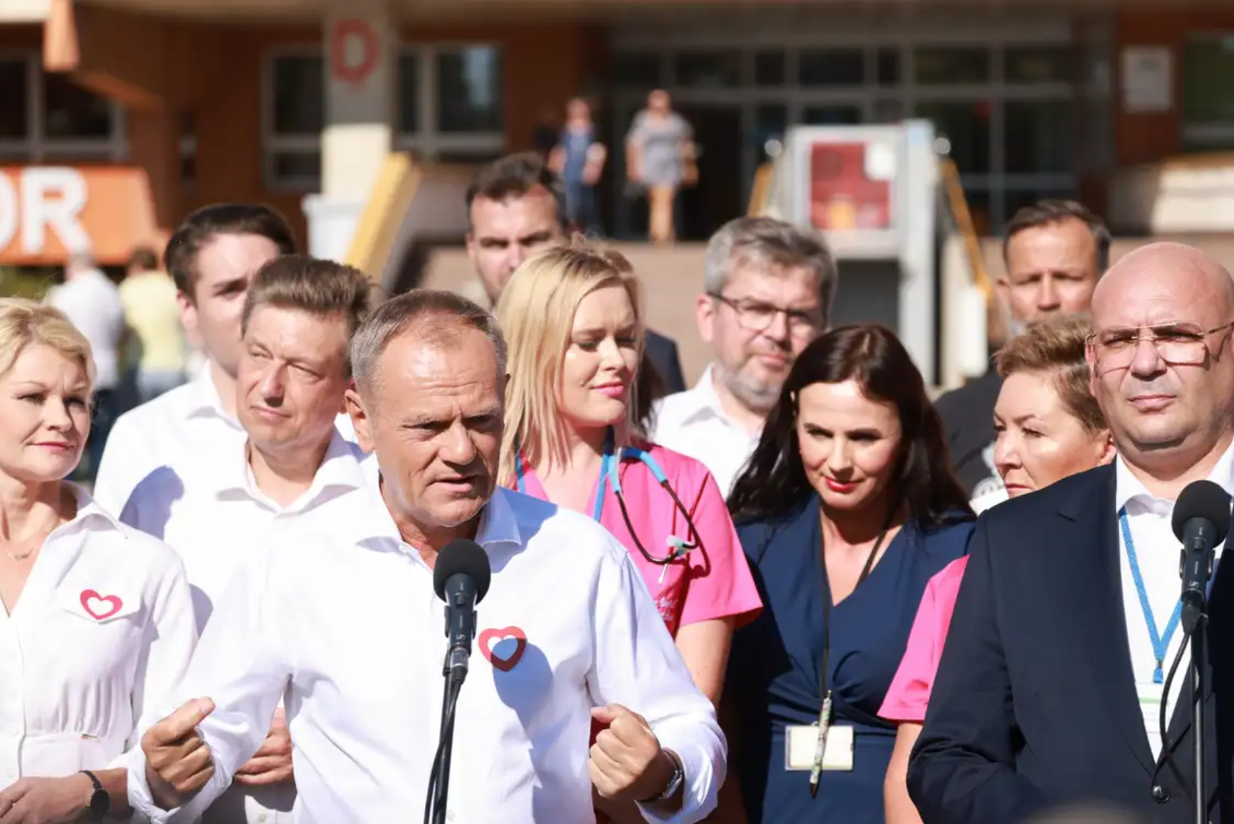 2023- konferencja przy szpitalu. Na zdjęciu Karolina Pawliczak, poseł Mariusz Witczak, obecny premier Donald Tusk, Anita Kaczorowska, radna , Jarosław Urbaniak- poseł, Radosław Kołaciński, radny miejski - wszyscy z Koalicji Obywatelskiej/ Platformy