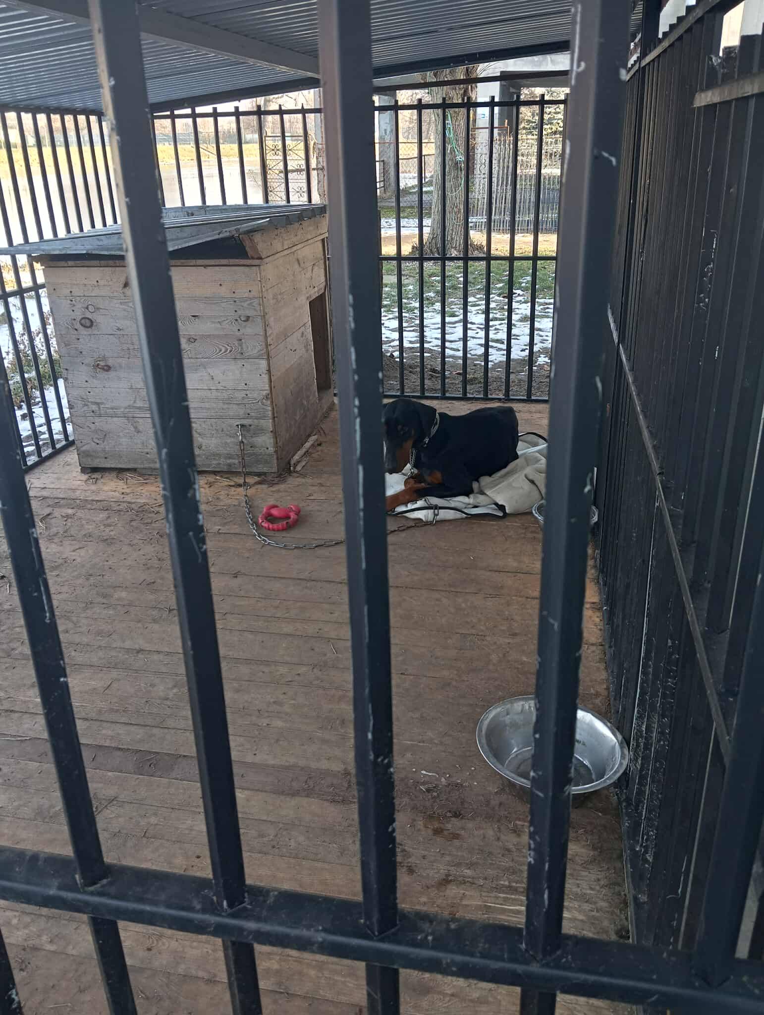 Ares, pięcioletni doberman, był przetrzymywany w skrajnie nieodpowiednich warunkach – w nieocieplonej budzie, w kojcu, na uwięzi, przy odczuwalnej temperaturze sięgającej –7 stopni Celsjusza. Pies był przypięty łańcuchem do budy, wychudzony, przemarznięty i wyraźnie przestraszony.