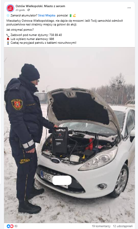 Tego samego dnia na miejskim profilu na Facebooku u naszych sąsiadów, w Ostrowie Wielkopolskim, opublikowano komunikat, w którym poinformowano, że tamtejsza Straż Miejska udziela pomocy kierowcom, których samochody nie chcą uruchomić się z powodu rozładowanego akumulatora. Jak przekazano, mieszkańcy mogą zadzwonić do dyżurnego lub pod numer alarmowy, a patrol wyposażony w kable rozruchowe zostanie wysłany na miejsce.