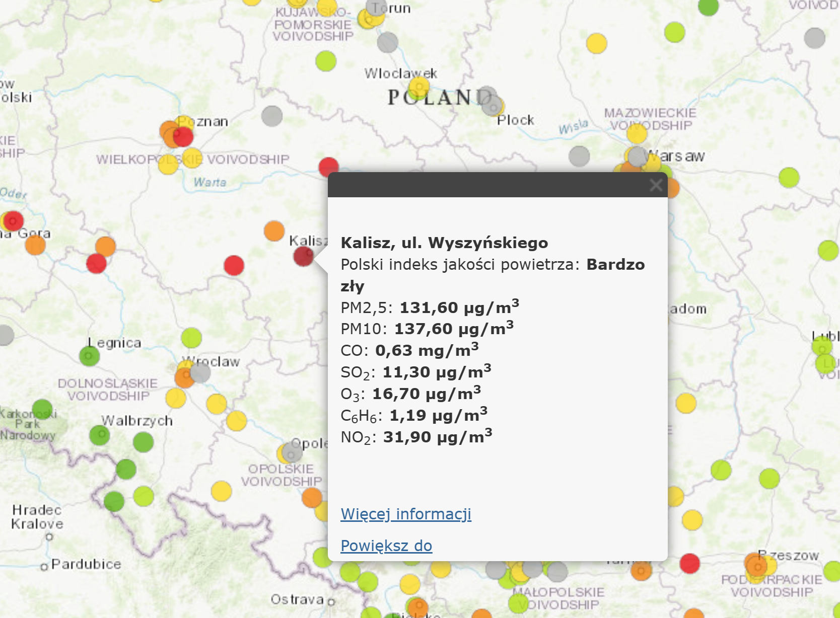 W naszym powietrzu najwięcej unosi się pyłów PM2,5 i PM10. Zazwyczaj są to niebezpieczne dla zdrowia drobne cząsteczki emitowane z pieców palenisk domowych. W Kaliszu pyłu PM,25 jest dziś pięciokrotnie więcej niż wskazuje norma roczna, pyłu PM10 jest niemal 3 razy więcej niż bezpieczna dla zdrowia norma.