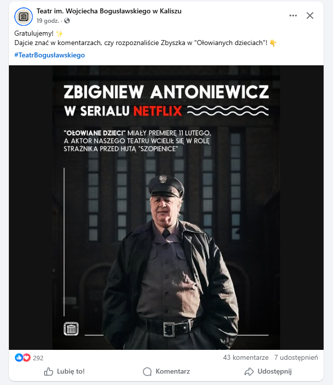 Aktor Teatru im. Wojciecha Bogusławskiego w Kaliszu, Zbigniew Antoniewicz, pojawił się w nowym serialu Netflixa „Ołowiane dzieci”. Produkcja już drugi tydzień utrzymuje się w pierwszej dziesiątce najchętniej oglądanych seriali platformy na świecie, a kaliskiego artystę zobaczyły miliony widzów na całym globie.