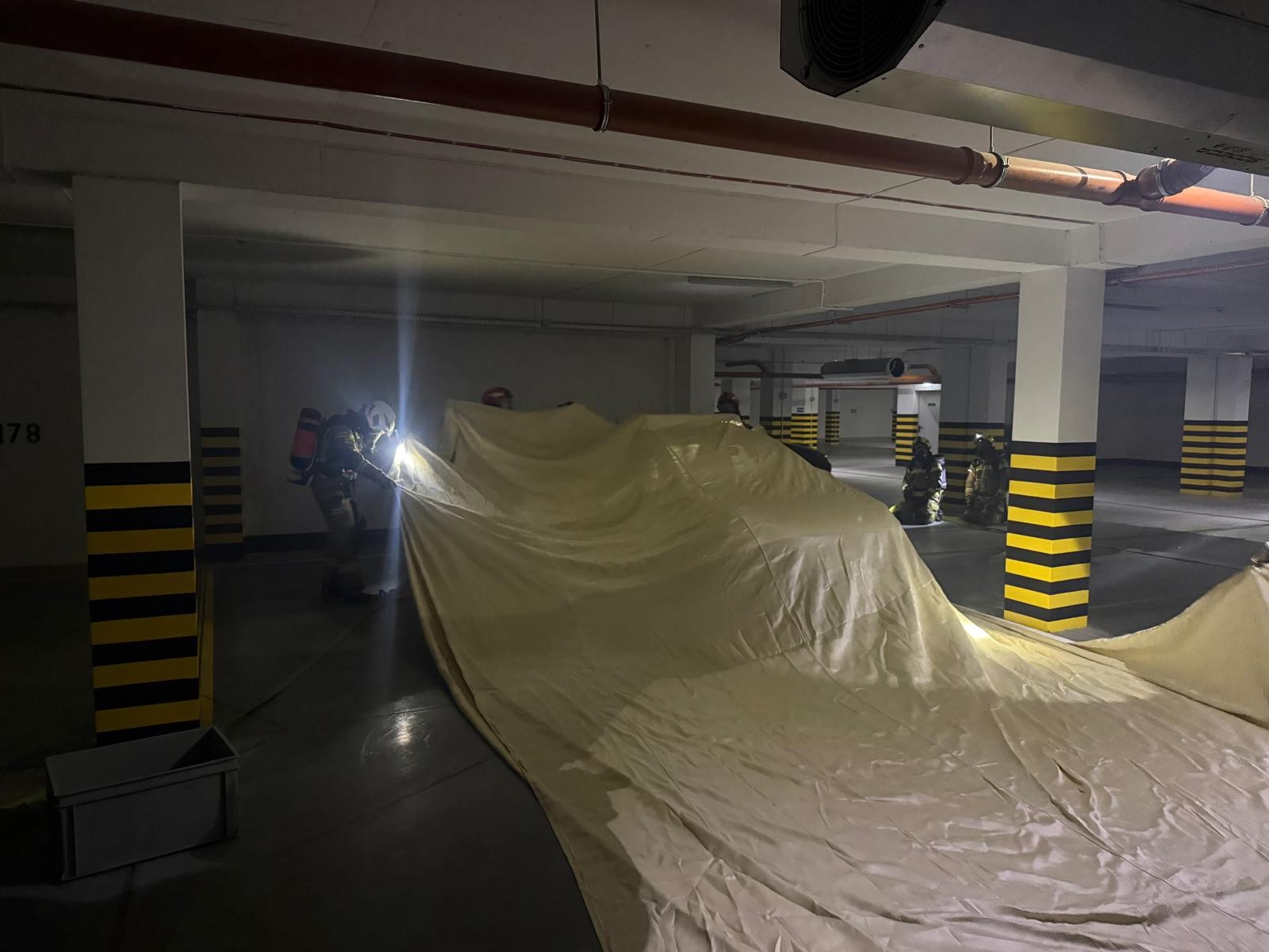Podczas ćwiczeń wykorzystano specjalistyczną płachtę gaśniczą przeznaczoną do tłumienia pożarów samochodów. Jej zastosowanie pozwala na szybkie ograniczenie rozprzestrzeniania się ognia i zadymienia w zamkniętej przestrzeni garażu, co ma istotne znaczenie dla bezpieczeństwa mieszkańców oraz samych ratowników.