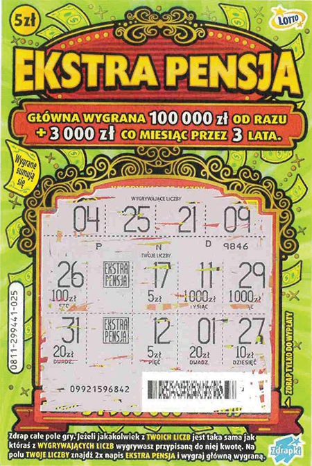 Wygrana w zdrapkach, konkretnie w Ekstra Pensji padła wczoraj, 4 marca. Szczęśliwy kupon, widoczny pod tekstem, gracz kupił w sklepie przy ul. Górnośląskiej 48. To duża wygrana, ale w popularnych zdrapkach Totalizatora Sportowego padały dużo większe wygrane, również w Kaliszu.
