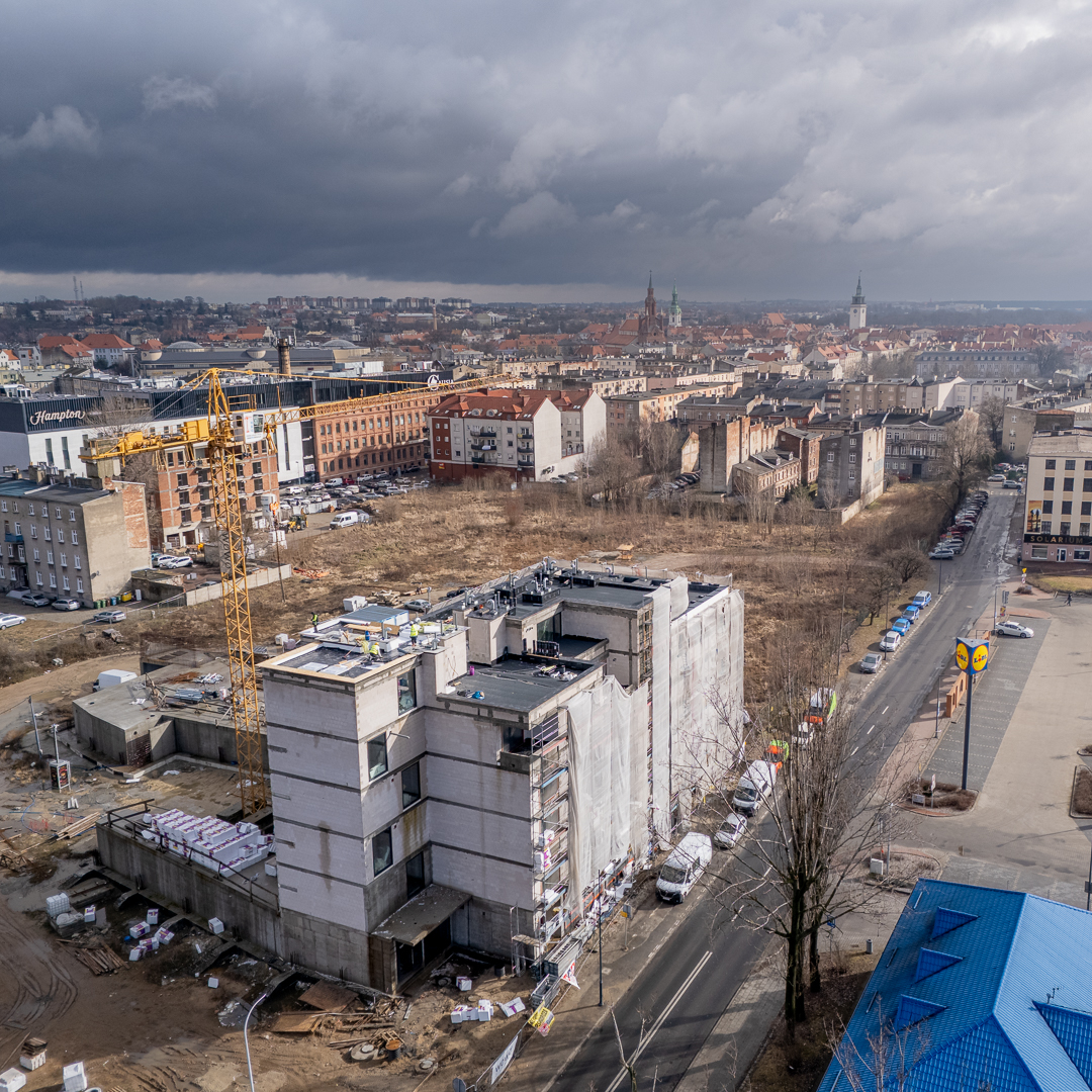 Pierwszy z budynków powstaje u zbiegu al. Wojska Polskiego z ulicą Złotą. Mroźna zima nie wstrzymała prac, a inwestor informuje o ważnych postępach.