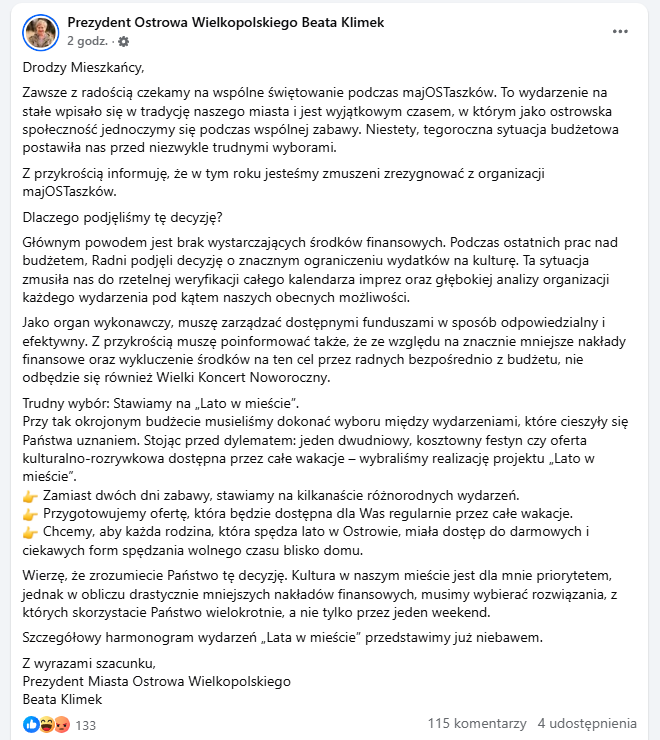 Jak wyjaśniła, powodem rezygnacji z organizacji MajOSTaszków jest trudna sytuacja budżetowa miasta. W trakcie prac nad budżetem radni zdecydowali o znacznym ograniczeniu wydatków na kulturę, co wymusiło weryfikację planowanych wydarzeń.