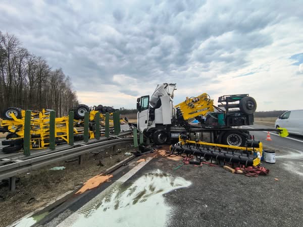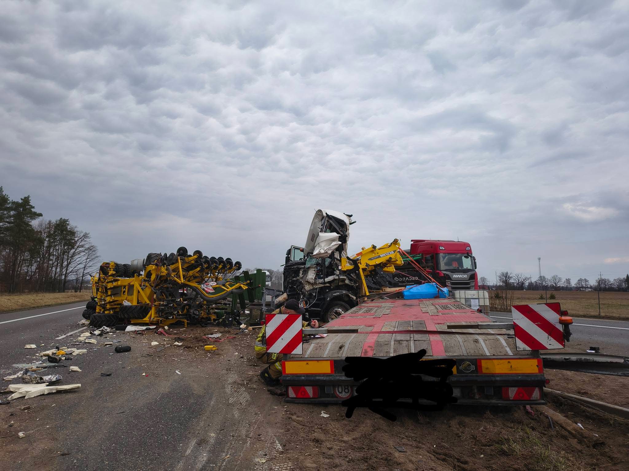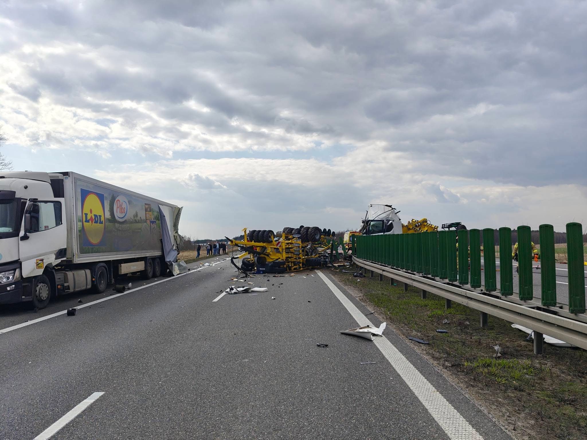 Jeden z pojazdów przewoził sprzęt rolniczy, załadunek przewrócił się na jezdnię.
