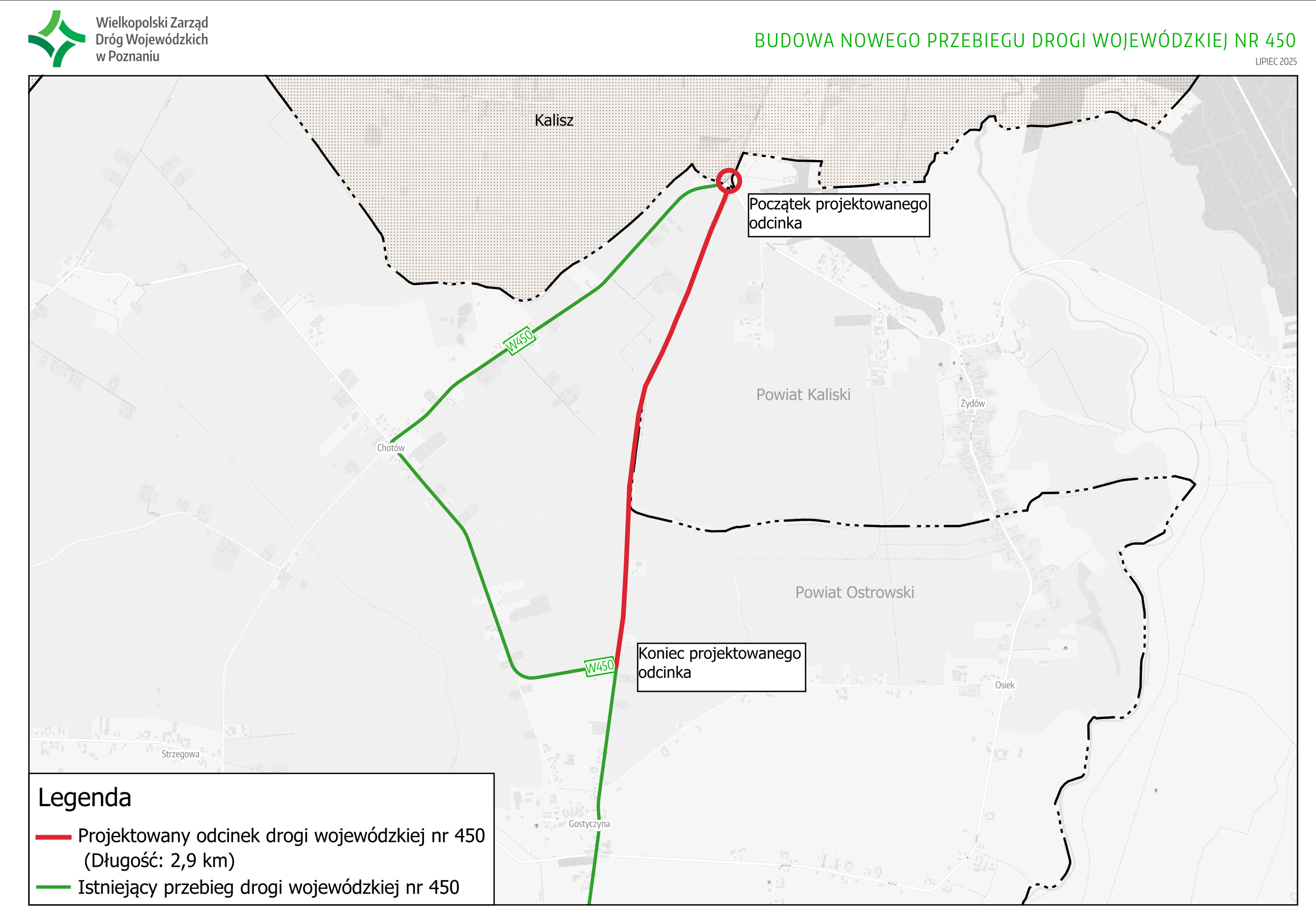 - Nowy odcinek drogi będzie przebiegał przez powiaty kaliski i ostrowski, obejmując gminy: Nowe Skalmierzyce, Godziesze Wielkie oraz fragment miasta Kalisz. Trasa rozpocznie się w rejonie skrzyżowania z drogą powiatową nr 4630P i dotychczasowym przebiegiem DW 450, a zakończy w miejscowości Gostyczyna – informuje Wojewódzki Zarząd Dróg.