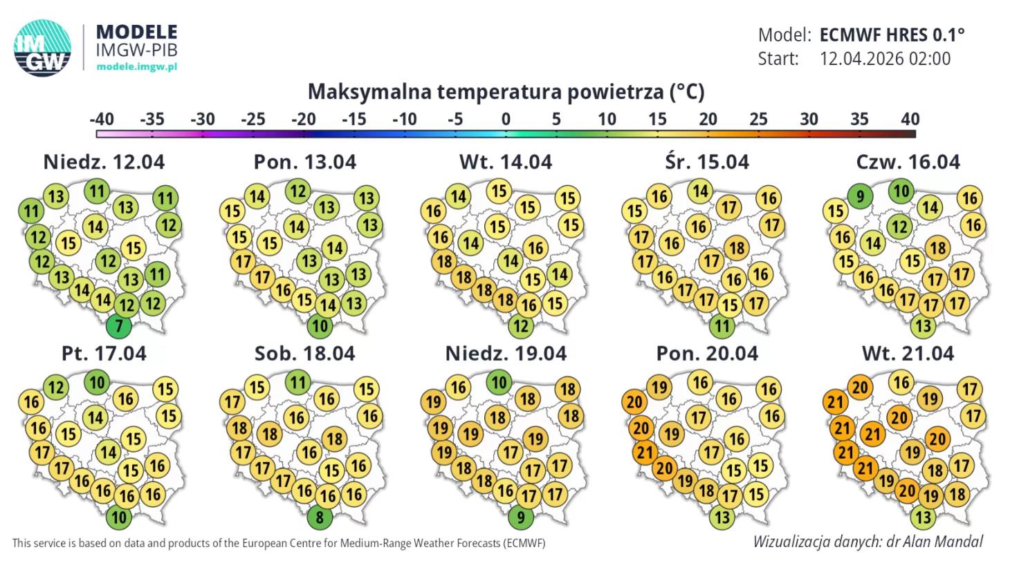 W kolejnych dniach zrobi się coraz cieplej: wtorek–środa: nawet 16–18°C w wielu regionach, koniec tygodnia: przeważnie 15–18°C, początek przyszłego tygodnia: lokalnie nawet 20–21°C! Najchłodniej tradycyjnie nad samym morzem i w rejonach podgórskich. Wygląda więc na to, że wchodzimy w coraz bardziej wiosenny, a miejscami wręcz ciepły okres – zapowiada Instytut Meteorologii i Gospodarki Wodnej.