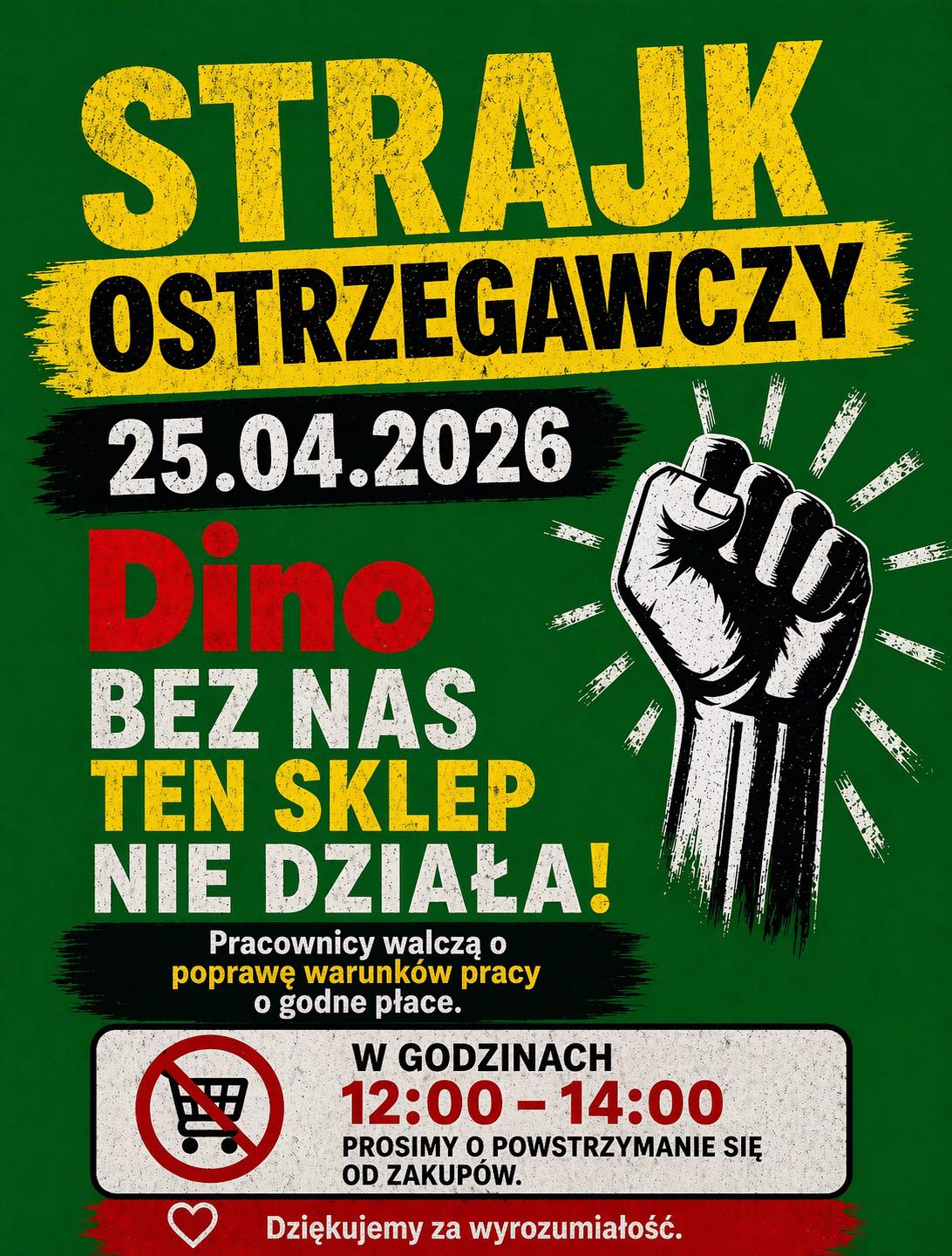 Strajk ostrzegawczy w Dino rozpocznie się 25 kwietnia 2026 r. w godzinach 12:00–14:00. W tym czasie markety i magazyny Dino Polska S.A. wstrzymują pracę. Zabezpieczamy stanowiska i wychodzimy przed zakłady pracy. Prawo do strajku jest prawem człowieka. Zwyciężymy – informuje OPZZ.