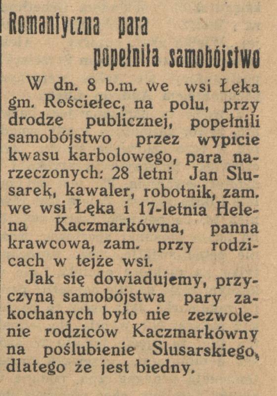 ,,W dn.8 b.m.we wsi Łęka gm. Rościełec, na polu, przy drodze publicznej popełnili samobójstwo przez wypicie kwasu karbolowego, para narzeczonych: 28-letni Jan Slusarek, kawaler, robotnik, zam. we wsi Łęka i 17-letnia Helena Karczmarkówna, panna, krawcowa, zam. przy rodzicach w tejże wsi.Jak się dowiadujemy przyczyną samobójstwa pary zakochanych był brak zgody rodziców Karczmarkówny na poślubienie Slusarskiego, dlatego że jest biedny’’ ("Gazeta kaliska", nr 109 z 21 kwietnia 1936 r.APK, Varia, sygn. 95)